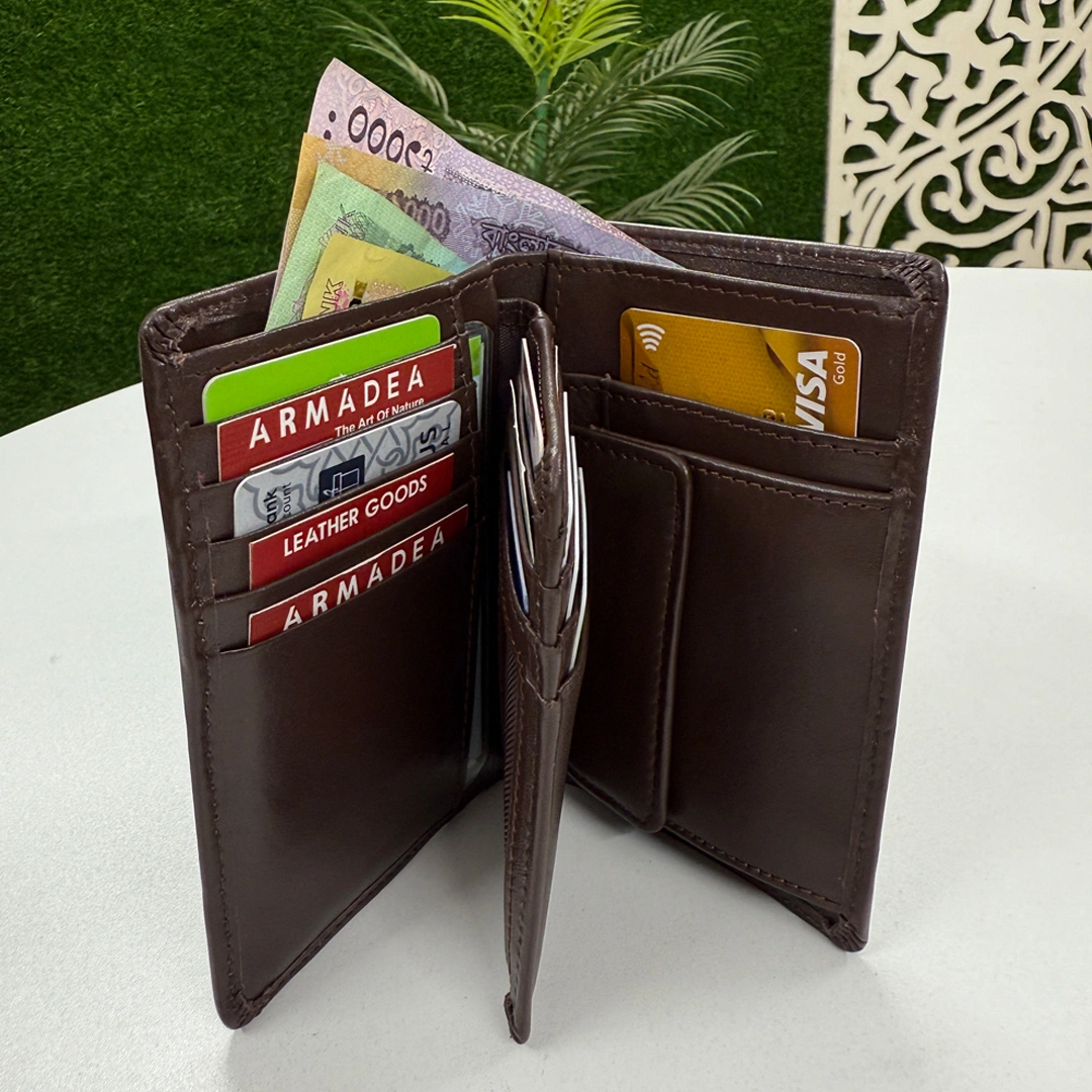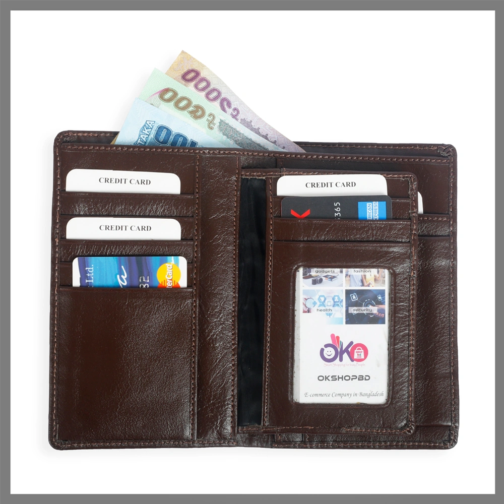 ৩ পার্ট এর প্রায় ২৩ টা কার্ড স্লট, কয়েন পকেট, ও ক্যাশ চেম্বারের সেমি লং ওয়ালেট।